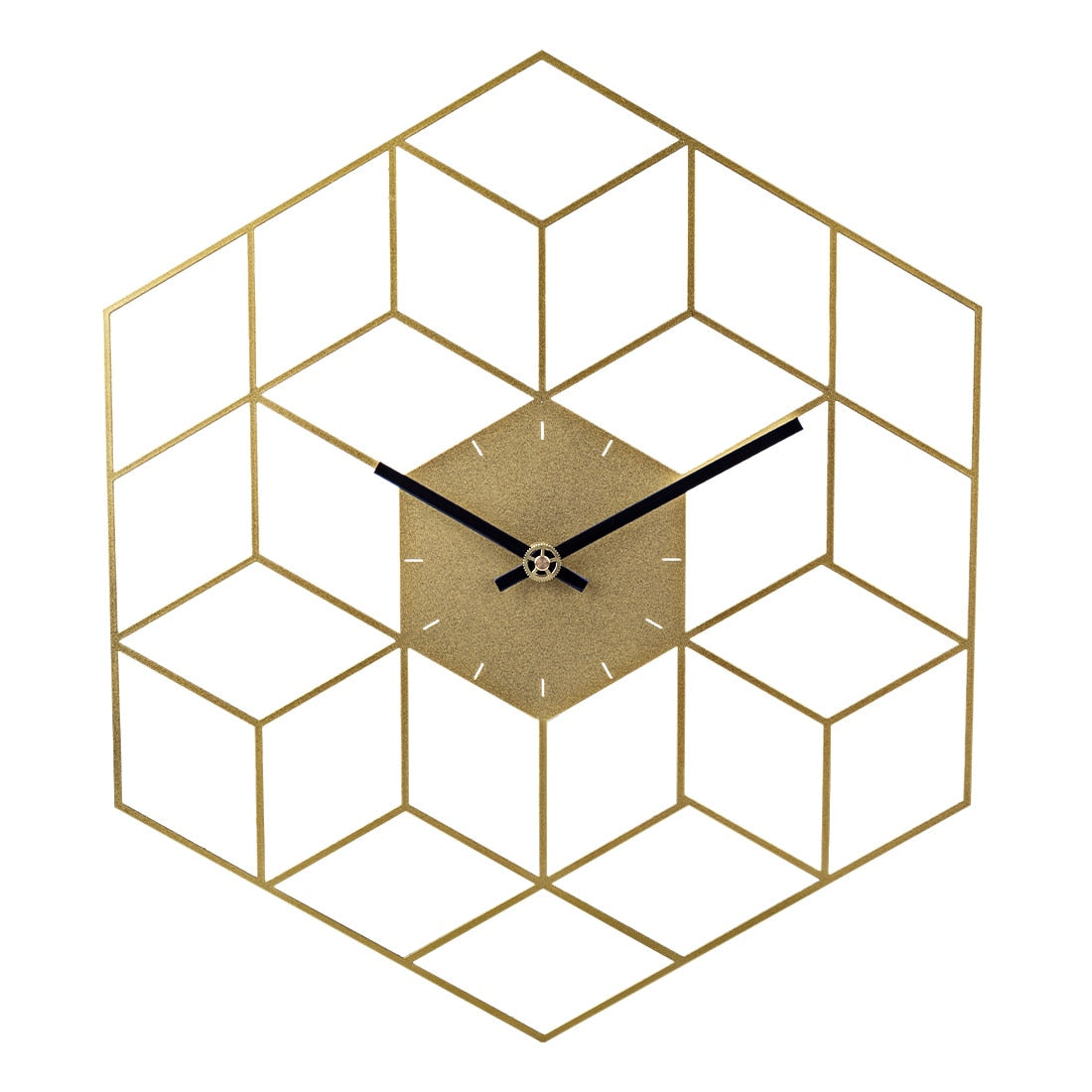 Dette vægur skiller sig ud med sit smarte geometriske design, der danner et spændende 3D terning mønster. Det gyldne metalarbejde er omhyggeligt udført for at skabe rene linjer og en elegant finish. Uret i midten, med sin subtile guldglimmer, er let at aflæse takket være de kontrastfyldte sorte visere. Det er et ur, der både er praktisk og dekorativt, og som vil imponere dine gæster med sin unikke æstetik. Det er et bevis på, at funktionelt design også kan være betagende smukt.