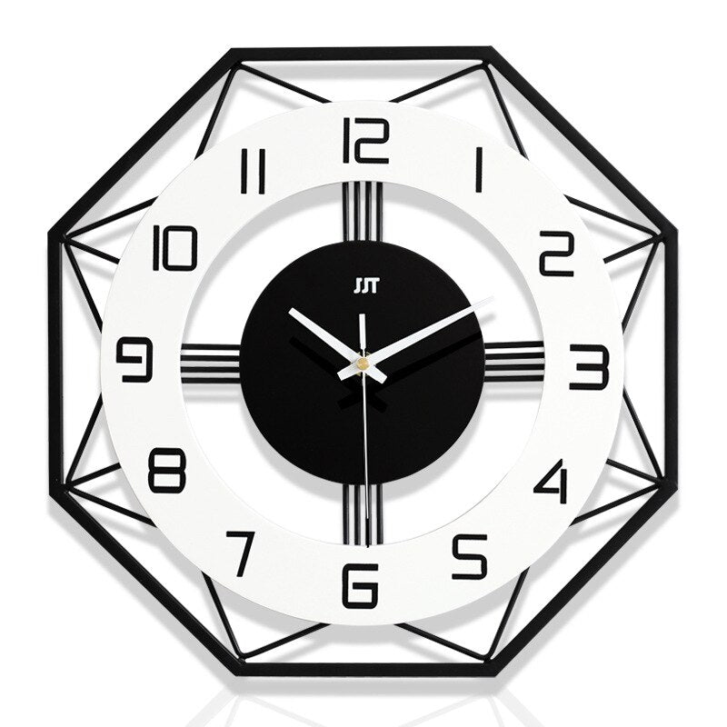 Leder du efter et vægur, der både er funktionelt og en æstetisk fryd for øjet? Vores geometrisk vægur med sort metalramme er lige, hvad du har brug for! Med sit ottekantede design og elegante sorte metalramme tilføjer det et moderne og stilfuldt touch til ethvert rum. Uanset om det er i stuen, soveværelset, kontoret eller køkkenet, vil dette ur ikke blot fortælle dig tiden, men også fungere som et unikt kunstværk på din væg. Glem kedelige ure – dette vægur er designet til at fange blikket og starte samtaler, og det vil helt sikkert imponere dine gæster.