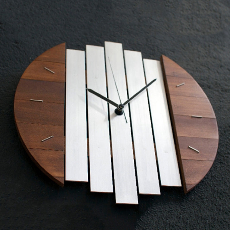 Dette vægur skiller sig ud med sin dekonstruerede form, hvor traditionelle linjer er brudt op og sammensat på en ny, spændende måde. De to halvcirkelformede træpaneler, der flankerer de vertikale hvide striber, giver uret en organisk, men alligevel struktureret følelse. De enkle, sorte visere bevæger sig stilfærdigt over den splittede baggrund og giver dig en letlæselig tidsvisning uden at kompromittere urets moderne udtryk. Hvert element er nøje udvalgt for at skabe et harmonisk og dog iøjnefaldende design, der passer perfekt ind i den moderne skandinaviske indretning.