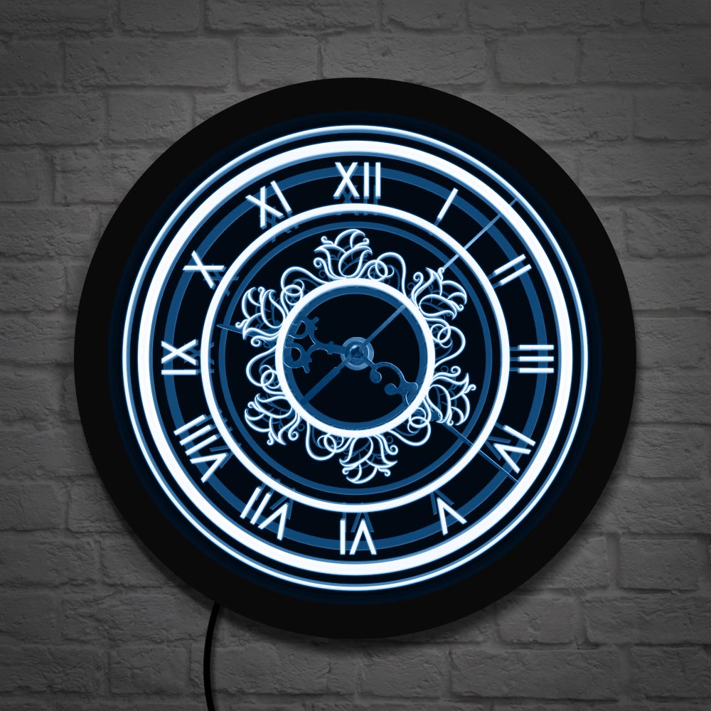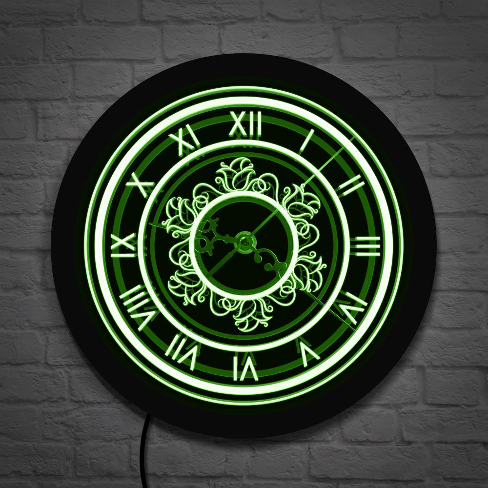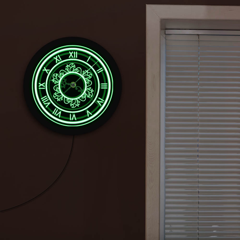 Dette vægur er mere end blot en tidsviser; det er en hyldest til klassisk design, opdateret med moderne teknologi. De skarpe, oplyste romertal lyser smukt op mod den mørke baggrund og sikrer, at du nemt kan aflæse tiden, selv i svagt lys. Det detaljerede mønster i midten af uret tilføjer et ekstra lag af æstetik, der understreger urets vintage-inspirerede look. Det er bygget til at holde og designet til at imponere, hvilket gør det til en investering i både din boligindretning og din hverdag. Lad dette ur være det centrale element, der samler dit rum og udtrykker din personlige stil.