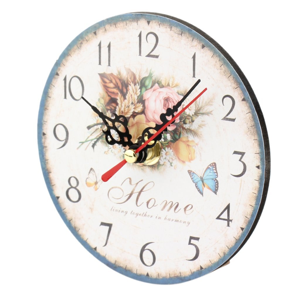 Vores vintage vægur i træ med blomstermotiv er designet til at vække glæde og tilføje et strejf af elegance til dit hjem. Træets naturlige årer og den let patinerede finish giver uret et autentisk vintage look, som ikke kan efterlignes. Urskiven er prydet med et malerisk blomstermotiv i bløde pastelfarver, der komplementeres af to yndefulde sommerfugle og teksten "Home living together in harmony". Denne kombination skaber et harmonisk og idyllisk udtryk, der inviterer til ro og hygge. Det er ikke bare et ur; det er et samtaleemne, et dekorativt element, der fortæller en historie og bringer liv til dine vægge. Det lydløse kvartsurværk sikrer, at du kun hører den stille tikken, hvis du lytter meget nøje, hvilket bidrager til en fredfyldt stemning.